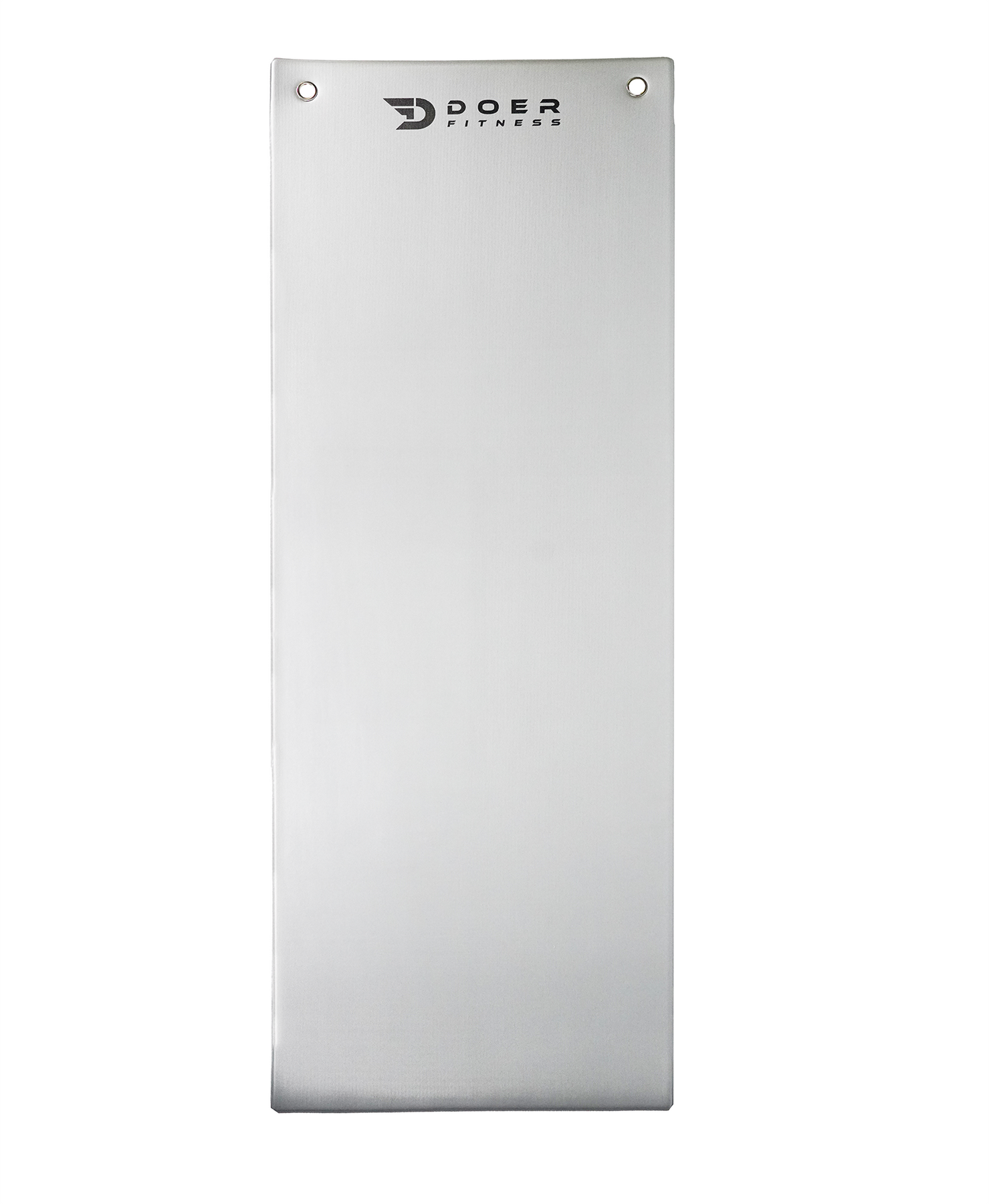 Doer Fitness yoga and gym mat with maximum cushion and superior grip for balance, contortion, and inversions. The extra thickness provides zero joint pain for hands, knees, and head while performing exercises. Features ringlets for easy storage for studios and gyms.